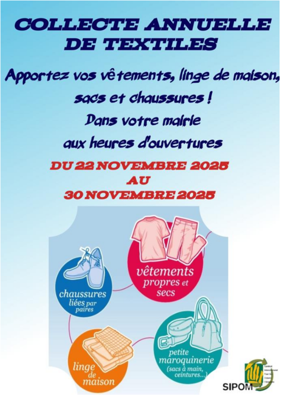 A l'occasion de la semaine européenne de la réduction des déchets (SERD) qui aura lieu du 22 au 30 novembre 2025, le Syndicat Intercommunal pour les Ordures Ménagères (SIPOM) renouvelle une opération de récupération des TLC : Textiles, Linge de Maison et Chaussures.